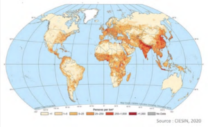 La carte ci-contre montre que la planète est inégalement peuplée. Les pays les plus densément peuplés en 2020 sont situés en Asie (Inde, Bangladesh, Corée du sud…) mais il y a aussi en Afrique des pays très densément peuplés (Nigeria, Rwanda). La densité démographique est souvent liée à l’urbanisation (sans parler des villes-États comme Singapour etc.).