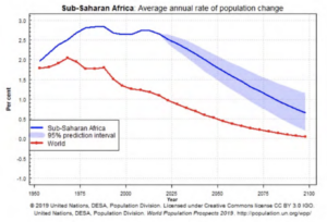 En Afrique subsaharienne le taux annuel de croissance démographique s’est stabilisé et a commencé à décroître légèrement à partir des années 85/90. Cette tendance devrait se prolonger dans le futur mais la croissance de la population en Afrique restera bien supérieure à celle du reste du monde dans les décennies à venir.