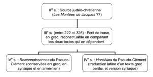 Cet « Écrit de base » dépendrait, à son tour, d’une source judéo-chrétienne, qui a également disparu, mais que l’on peut retrouver dans une section particulière des Reconnaissances (I.27-71), dont les limites exactes sont discutées. Ce développement, qui apparaît comme un corps étranger, remonterait au IIe siècle et pourrait être, selon certains savants, tiré des Montées de Jacques, un apocryphe perdu.