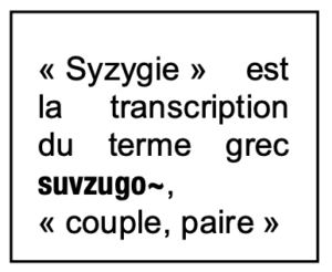 Chacune de ces syzygies est composée de pôles complémentaires, mais opposés : de même que la nuit s’oppose au jour, et l’ignorance à la connaissance, ainsi chacune des paires est composée d’un individu élément positif et d’un élément négatif. L’identification de l’élément positif ne fait pas difficulté : pour ce qui concerne la création, le pôle positif précède le pôle négatif, mais, pour ce qui touche aux hommes, le principe est inversé, pour forcer les hommes à chercher ce qui est juste. De fait, dans chacun des couples relevés dans le roman pseudo-clémentin, le premier élément mentionné est négatif : Caïn, « injuste », le « corbeau noir » du Déluge, identifié comme l’« esprit impur », Ésaü, « impie », et Aaron, « grand-prêtre » et surtout sacrificateur – les sacrifices sont vivement critiqués par l’auteur du roman pseudo-clémentin, comme indignes de la pureté de Dieu (Homélies, II.44.2)…. et Jean-Baptiste.